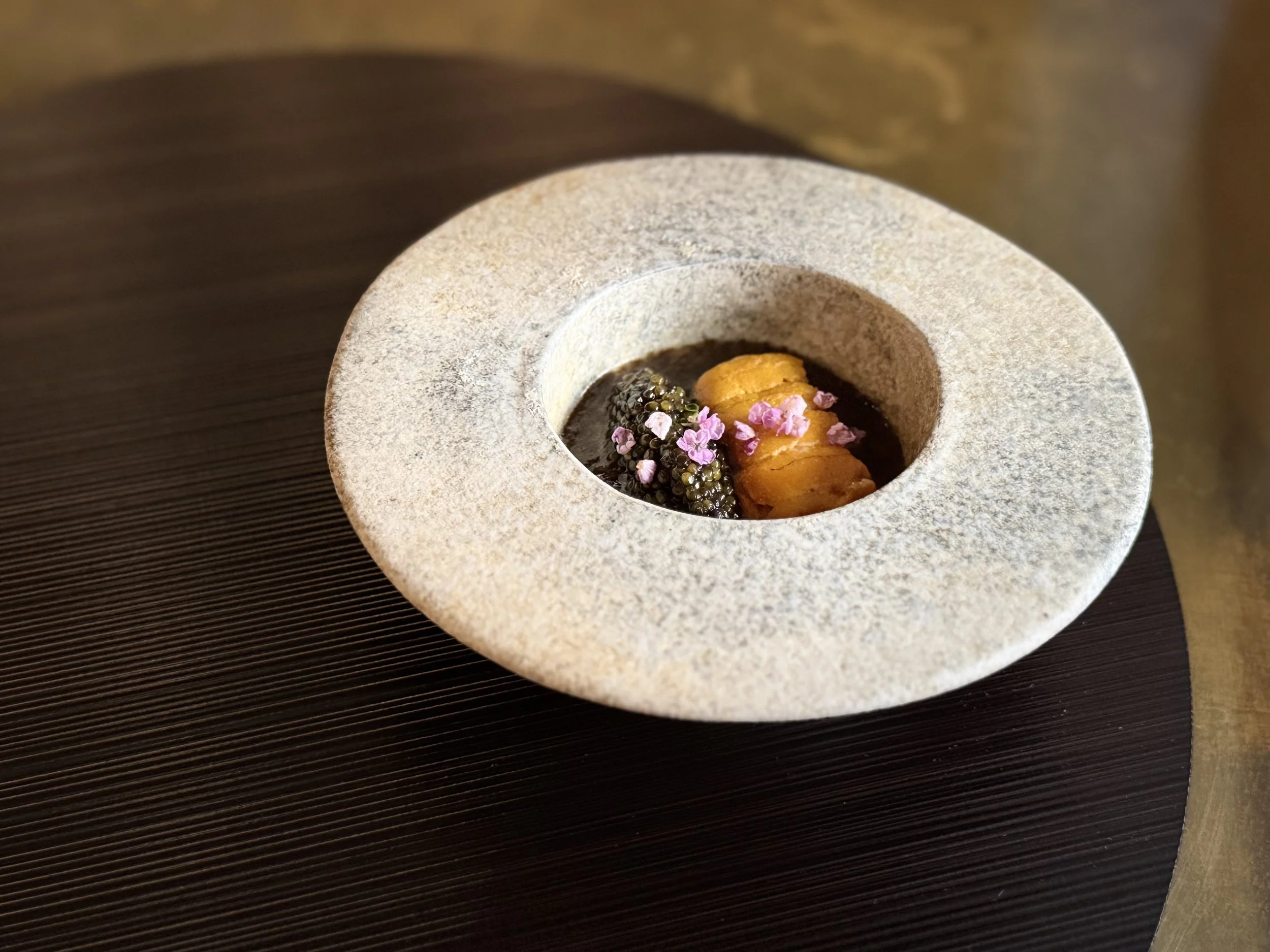 As part of our Fall 2025 menu, we are delighted to feature the highly-prized Matsutake mushroom. This celebrated ingredient takes center stage in our third course, the Owan. Here, slices of Matsutake are gently warmed in a delicate broth made from the bones of Hamo (Japanese Pike Conger), accented with a touch of Sudachi citrus. This seasonal soup course is designed to be a pure and elegant expression of autumn's finest offerings.